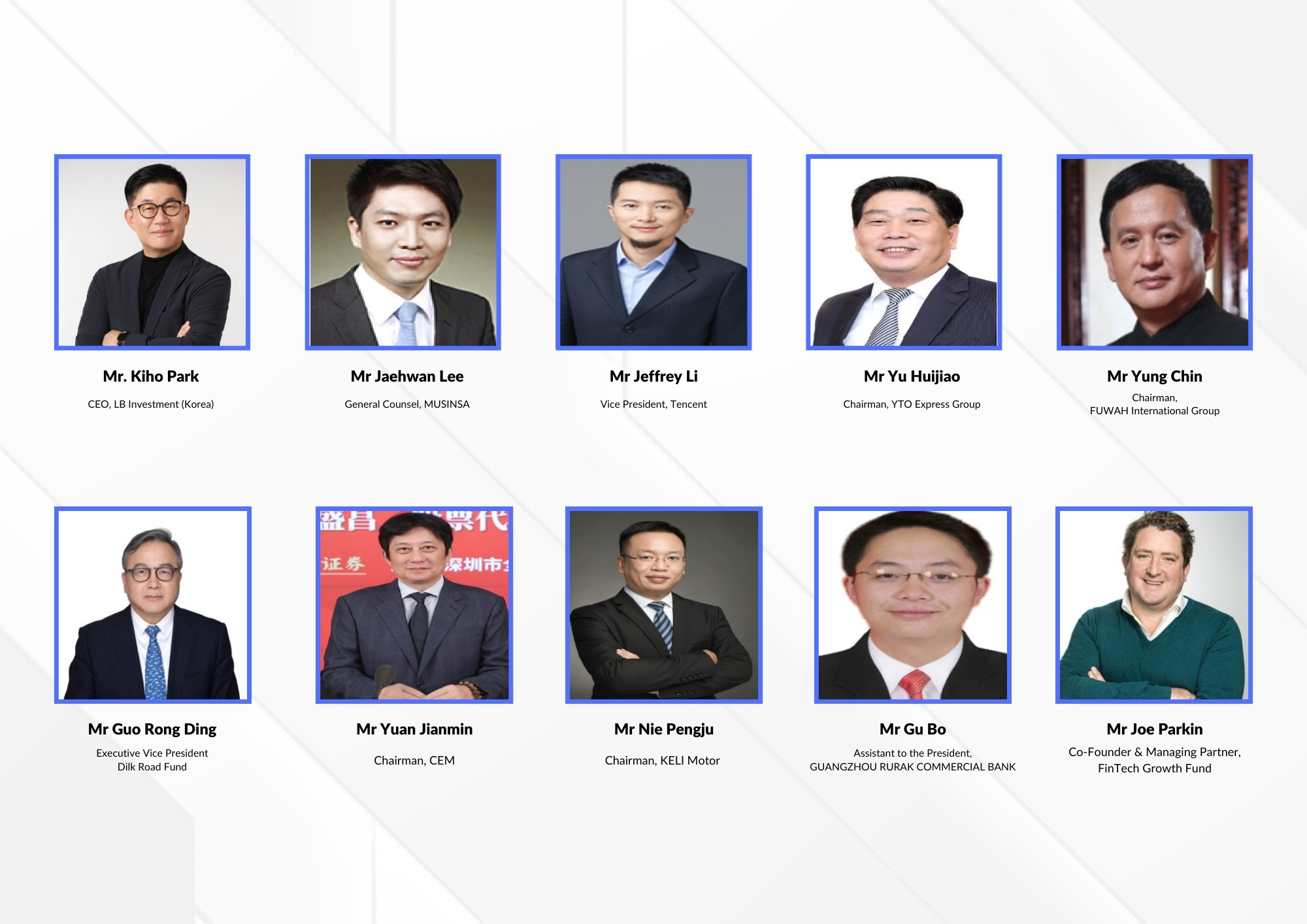 ويشارك ايضًا قو بو – مساعد رئيس بنك جوانزو GUANGZHOU RURAL COMMERCIAL BANK، وكاي جيان – عضو في اللجنة الدائمة للجنة مقاطعة هوادو لمدينة قوانغتشو Standing Committee of the Huadu District Committee of Guangzhou City وأمين لجنة فحص الانضباط لبنك قوانغتشو Discipline Inspection Committee of the Bank of Guangzhou. وجو باركين – المؤسس المشارك والشريك الإداري، لصندوق FinTech Growth Fund، والذي يتمتع بخبرة واسعة في مجال التكنولوجيا المالية والخدمات المالية.