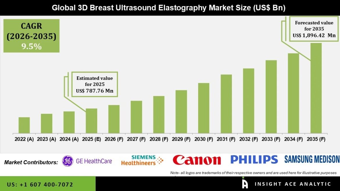 InsightAce Analytic Pvt. Ltd. announces the release of a market assessment report on theGlobal 3D Breast Ultrasound Elastography Market Size, Share & Trends Analysis Report By Modality (Handheld Ultrasound Systems, Automated Breast Ultrasound (ABUS), and Hybrid Ultrasound + Elastography Units), By Deployment Model )Standalone Console, Cloud-integrated Imaging Platforms, and AI-enabled Advanced Workstation), By Risk Class (Class II Medical Imaging Devices and Class III (High Precision Oncologic Diagnostic Usage)), By Application (Breast Cancer Screening, Therapy Monitoring, Pre-operative Planning, Lesion Characterisation, Research/Academic, and Dense Breast Imaging), By Technology (3D Shear Wave Elastography (SWE), 3D Strain Elastography, and Hybrid/Integrated Elastography Systems), By End-user (Hospitals, Diagnostic Imaging Chains, Mobile/Remote Screening Units, Breast Cancer Screening Centres, and Research & Academic Institutes), By Distribution Channel (OEM Direct Sales, Hospital Group Procurement, Distributor-based Sales, and Tender-based Government Acquisition),- Market Outlook And Industry Analysis 2035″