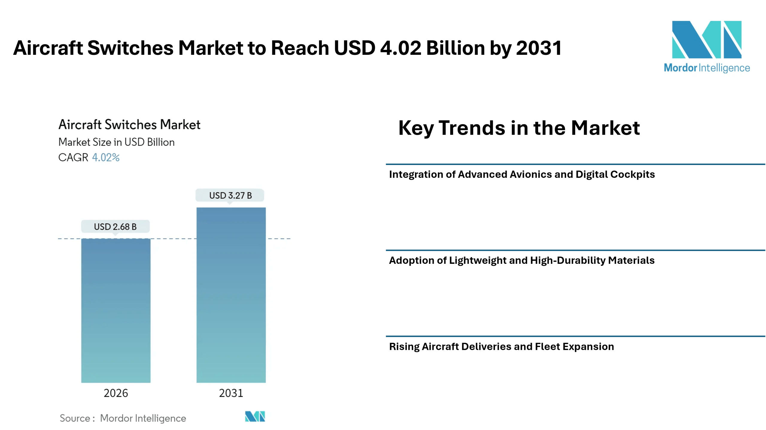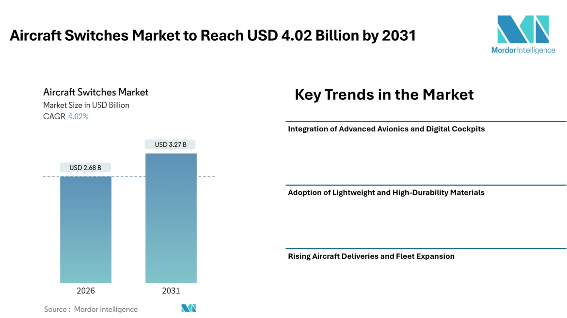 The global aircraft switches market was valued at USD 2.68 billion in 2026 and is projected to reach USD 3.27 billion by 2031, expanding at a compound annual growth rate (CAGR) of 4.02% during the forecast period. This steady expansion reflects the rising adoption of next-generation avionics, increased aircraft manufacturing activity, and the aviation industry’s continued emphasis on safety, reliability, and cockpit ergonomics.