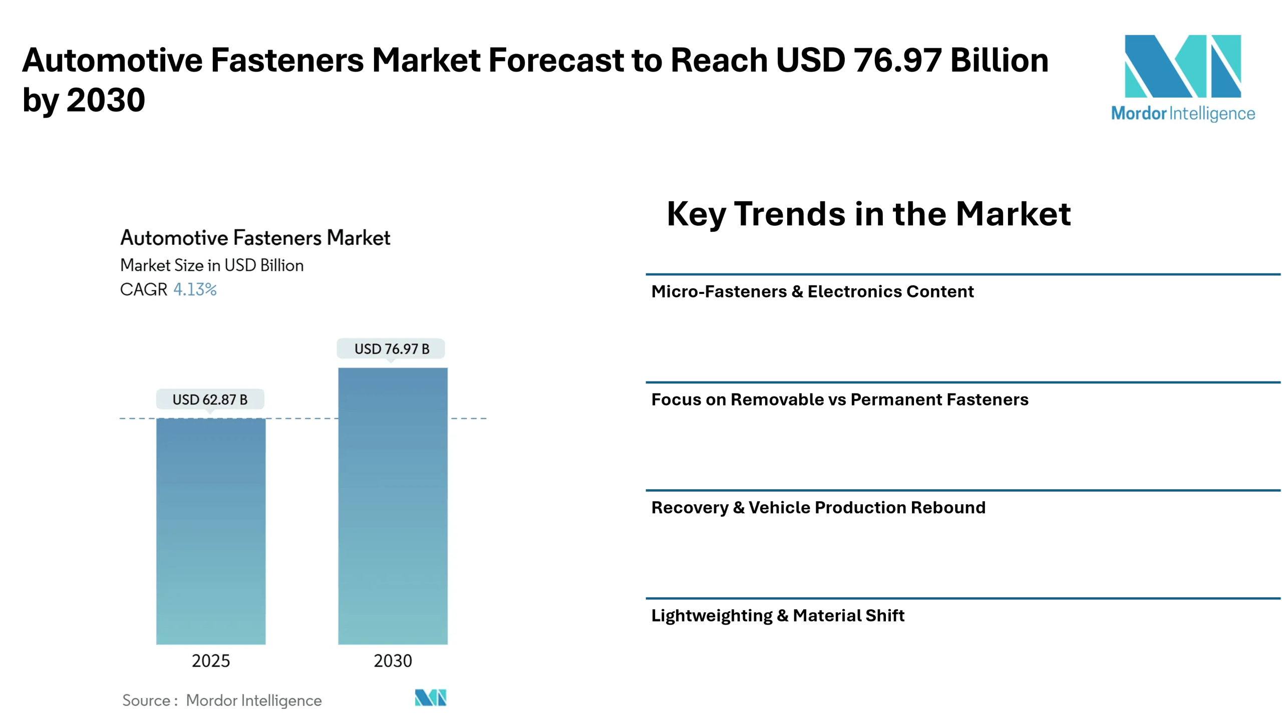 Home Press ReleasesAutomotive Fasteners Market Forecast to Reach USD 76.97 Billion by 2030, Driven by Rising Vehicle Production and Lightweight Material Adoption – Mordor Intelligence