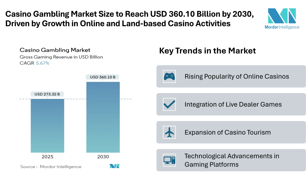 The Casino Gambling Market size in terms of gross gaming revenue is projected to grow from USD 273.32 billion in 2025 to USD 360.10 billion by 2030, registering a CAGR of 5.67% during the forecast period (2025–2030). This growth reflects increasing global demand for both land-based and online casino gaming, driven by rising internet penetration, regulatory developments in various countries, and the popularity of live dealer games. The Casino Gambling Market expansion is also supported by tourism growth, advanced gaming technology, and changing consumer preferences toward online platforms that offer convenience and immersive experiences.