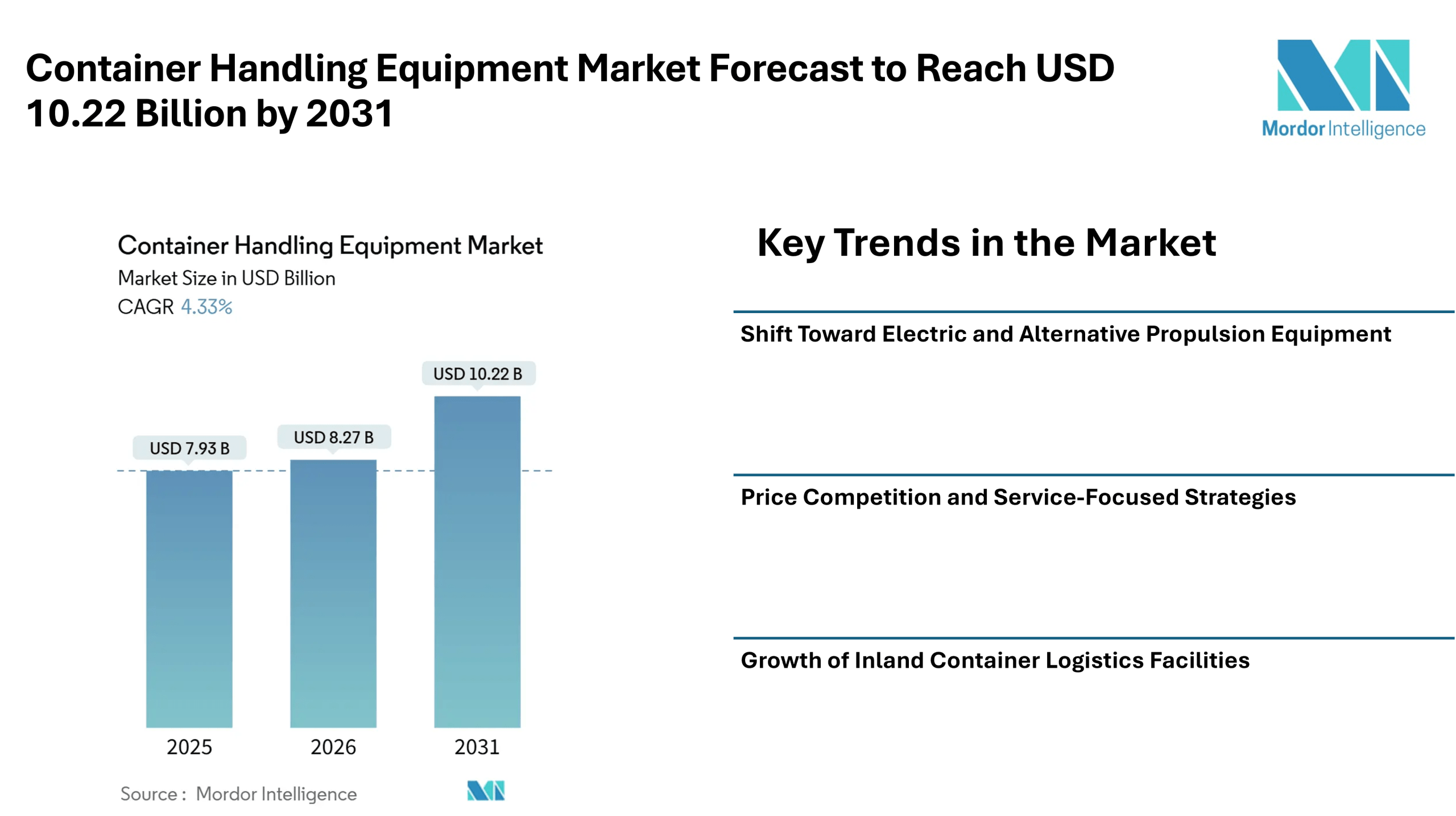 According to Mordor Intelligence, the container handling equipment market size is expected to grow from USD 7.93 billion in 2025 to USD 8.27 billion in 2026, with the container handling equipment market forecast indicating it may reach USD 10.22 billion by 2031. This progress reflects consistent investments in cargo handling infrastructure and modern equipment used in terminals, depots, and freight facilities worldwide.