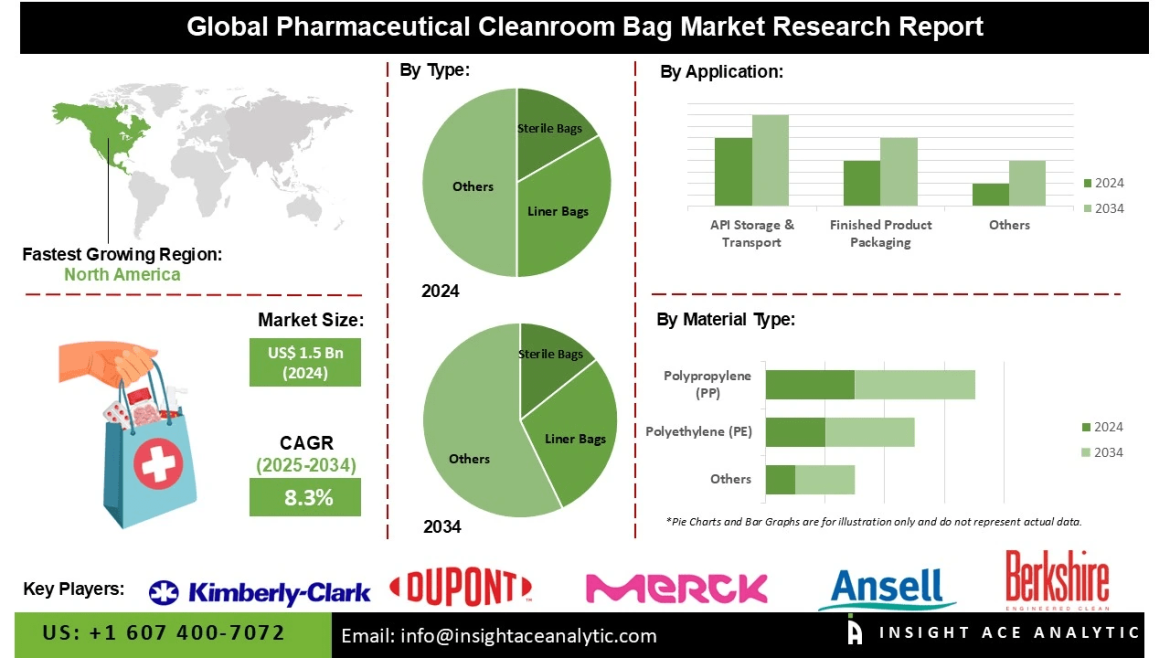 InsightAce Analytic Pvt. Ltd. announces the release of a market assessment report on theGlobal Pharmaceutical Cleanroom Bag Market Size, Share & Trends Analysis Report By Type (Liner Bags, Sterile Bags, and Zipper Bags), By Material Type (Nylon, Polyethylene (PE), Polypropylene (PP), and Others), By Application (API Storage & Transport, Finished Product Packaging, Waste Disposal, and Equipment Covers),-Market Outlook And Industry Analysis 2034″