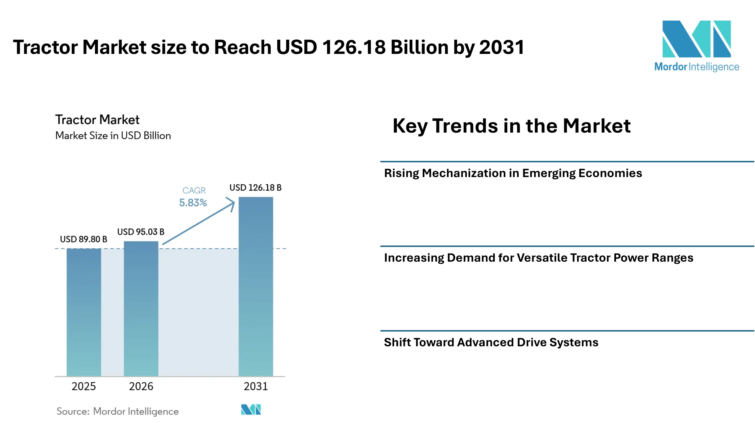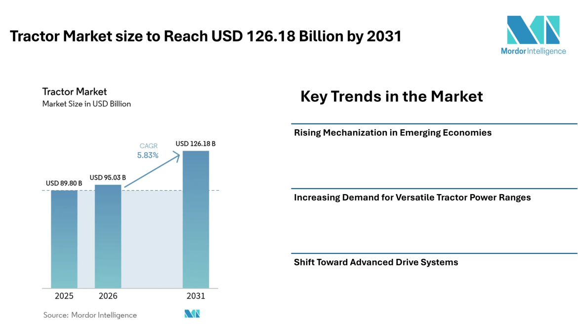 According to Mordor Intelligence, the tractor market size is estimated at USD 95.03 billion in 2026, increasing from USD 89.8 billion in 2025, and is projected to reach USD 126.18 billion by 2031, registering a CAGR of 5.83% during the forecast period.